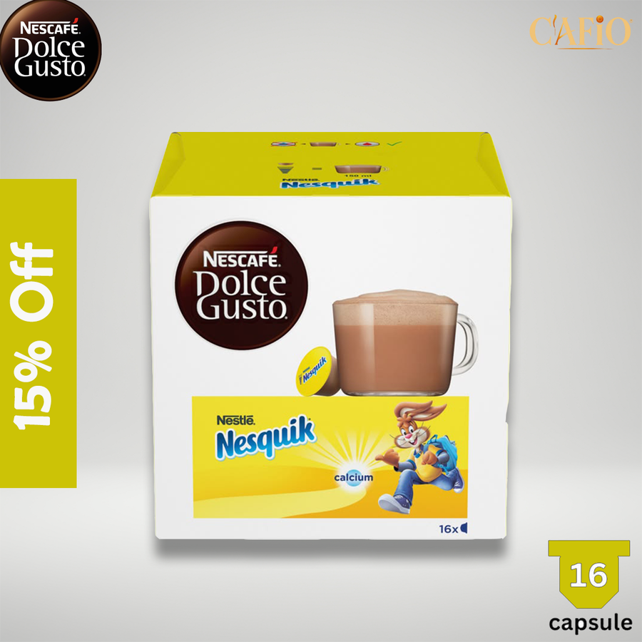 Nescafé Dolce Gusto Nesquik Capsules bring the classic taste of Nesquik chocolate drink to your Dolce Gusto machine. A smooth, creamy cocoa beverage enriched with calcium—perfect for kids and chocolate lovers alike.